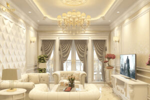 Rèm tân cổ điển cao cấp cùng màu sắc trang nhã thì tất nhiên các chi tiết hoa văn phải sang trọng cầu kì góp phần tạo nên sức hấp dẫn cho loại rèm tân cổ điển ấn tượng này. Các chi tiết họa tiết, hoa văn mang nét đặc trưng của nền kiến trúc tân cổ điển nó thể hiện được sự công phu, tỉ mỉ mềm mại và cầu kì hình thành một không gian nội thất với tinh thần mới mẻ và tinh tế.